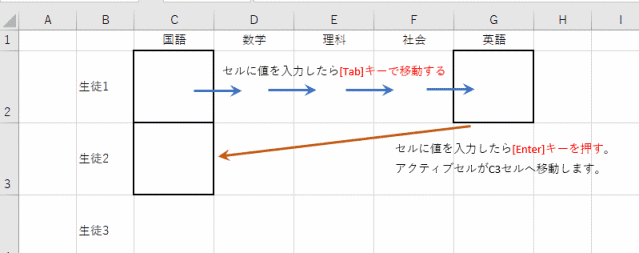 - 横方向のセルへの入力は[Tab]キーを使います。[Enter] キーで最初に[Tab]キーで移動したセルの下に移動します。