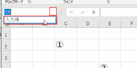 - 「名前ボックス」で『入力順』を選択すると、名前を定義した範囲が選択された状態になります。