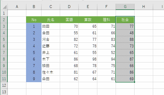 G2セルを選択して、[Shift]+[Ctrl]+[↓] でG2:G11を選択します。