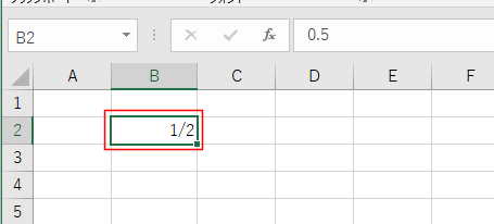 セルには 1/2 と表示され、数式バーには 0.5 と表示されます。つまり、値は0.5となっていますので計算が可能です。