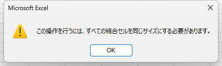 - 「この操作を行うには、すべての結合セルを同じサイズにする必要があります。」と注意されます。