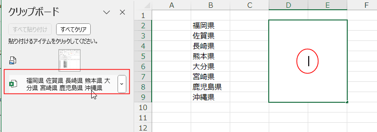 クリップボード の先ほどコピーした値(福岡県〜沖縄県)を選択します。