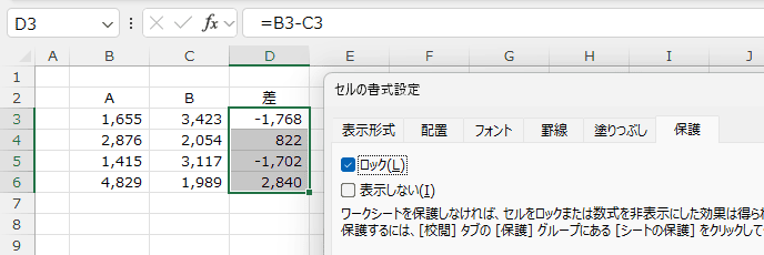 [保護]タブを選択して、ロックのチェックのオン/オフで設定することができます。