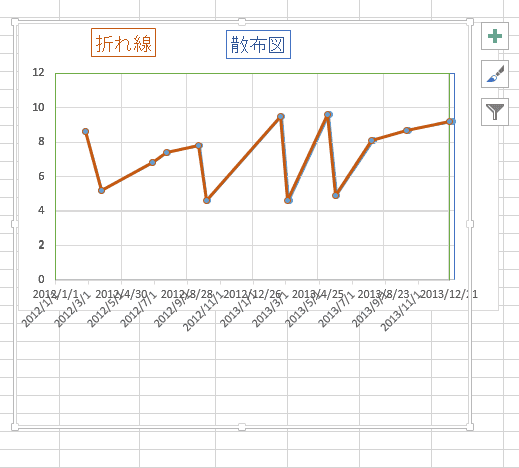 - 結論ですが、日付軸の散布図を作成したい・・・というケースでは折れ線グラフを使ったほうがよいケースもありそうです。
