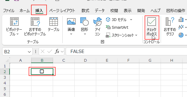 [挿入]タブのコントロール グループの「チェックボックス」を選択します。