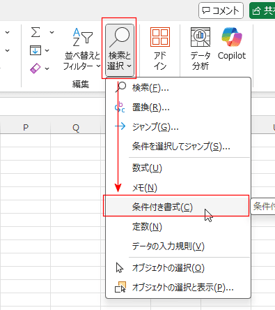 - [ホーム]タブの編集グループの[検索と選択]→[条件付き書式]を選択します。