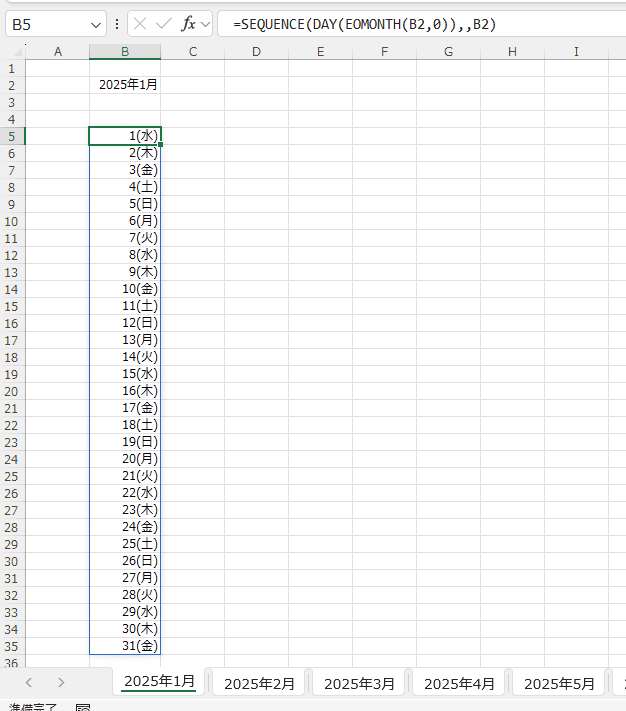 | Sub sheet_add() Dim i As Long For i = 1 To 12 ActiveWorkbook.Sheets.Add.Name = "2025年" & 13 - i & "月" Range("B2").Value = DateSerial(2025, 13 - i, 1) Range("B2").NumberFormatLocal = "yyyy""年""m""月""" Range("B5").Formula = "=SEQUENCE(DAY(EOMONTH(B2,0)),,B2)" Range("B5:B35").NumberFormatLocal = "d(aaa)" Next i End Sub |