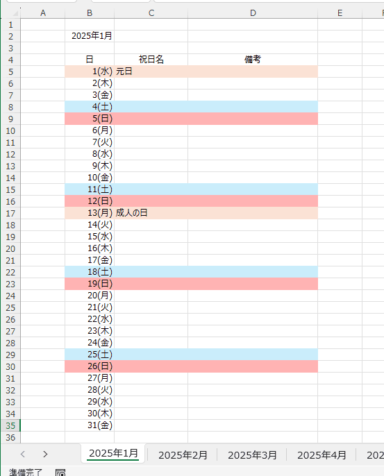 | 祝日の行に条件付き書式を設定する | 土日のセルや行に色を付ける |