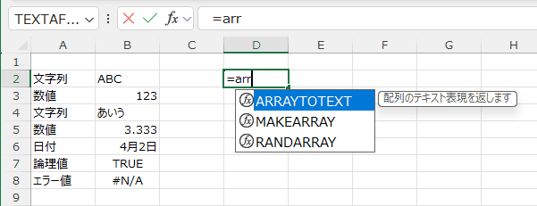 =arr と入力すると、数式オートコンプリートの機能でarrを含む関数がリスト表示されます。