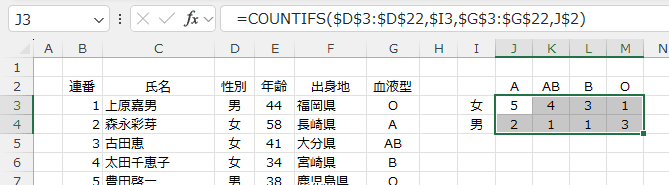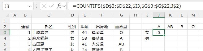 - 男のA型を求める場合は =COUNTIFS($D$3:$D$22,$I3,$G$3:$G$22,J$2) とします。