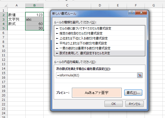 条件付き書式で =ISFORMULA(B2) と条件を数式で入力します。