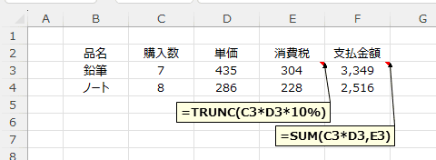 E3セルには =INT(C3*D3*10%) 、F3セルには =SUM(C3*D3,E3) と入力しました。
