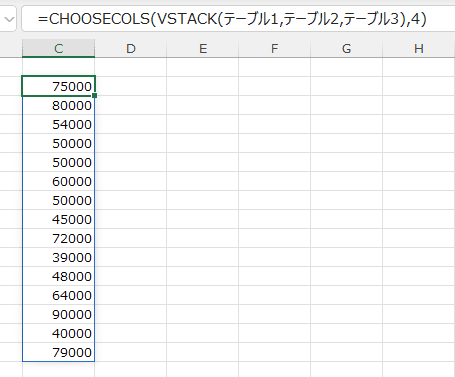- CHOOSECOLS(VSTACK(テーブル1,テーブル2,テーブル3),4)