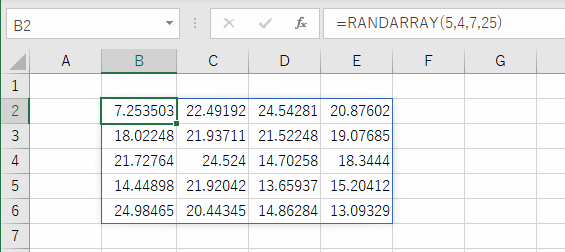 下図は=RANDARRAY(5,4,7,25)と小数値で表示して、=RANK(B2#,B2#)+6 とRANK関数で順位をつけてみました。