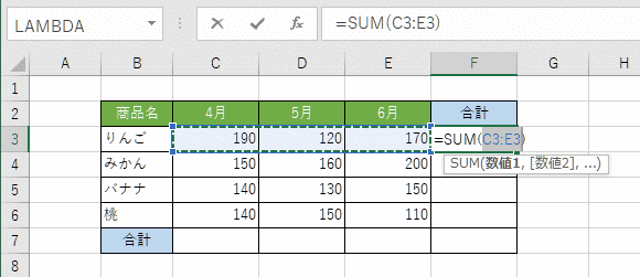 F3セルには =SUM(C3:E3) と表示されます。この数式で良い場合は[Enter]キーを押します。
