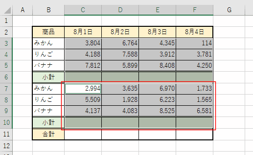小計のC6:F6 と C10:F10 に合計の数式が入力されました。