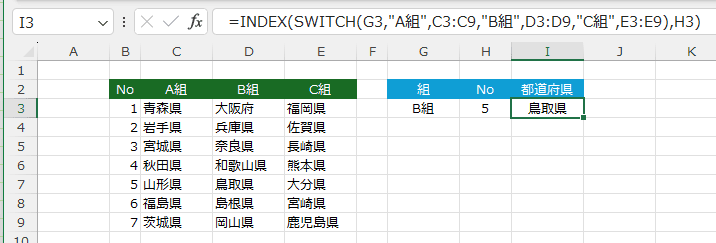 - I3セルに =INDEX(SWITCH(G3,"A組",C3:C9,"B組",D3:D9,"C組",E3:E9),H3) と入力しました。
