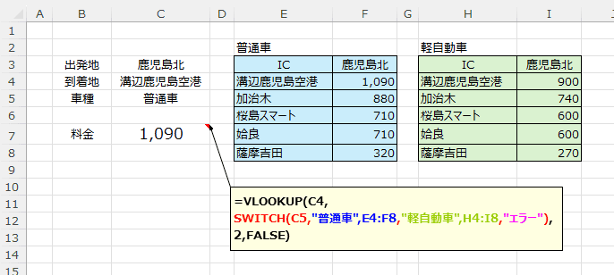 =VLOOKUP(C4,SWITCH(C5,"普通車",E4:F8,"軽自動車",H4:I8,"エラー"),2,FALSE)