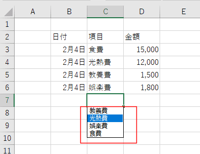 - 同じ表の列に入力する文字列がある場合は、[Alt] +[↓]キーで候補が表示されます。
