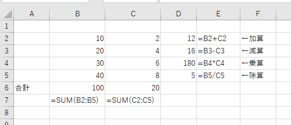 - 数式や関数を使うときは最初に「=」(イコール)を入力します。