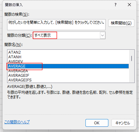 [関数の分類]を[全て表示]にすると、関数がアルファベット順に表示されます。