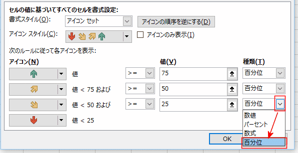 ここでは 種類を「パーセント」で、値は4区分の値が指定してあります。