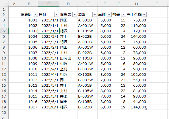 先頭行はフィールド見出しになり、フィルターボタンが表示されました。