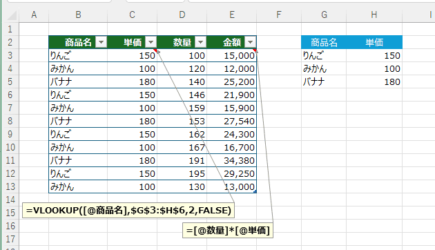 C3セルに =VLOOKUP([@商品名],$G$3:$H$6,2,FALSE)