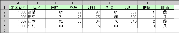| 出席番号 | 氏名 | 国語 | 算数 | 理科 | 社会 | 合計 | 順位 | 評価 |