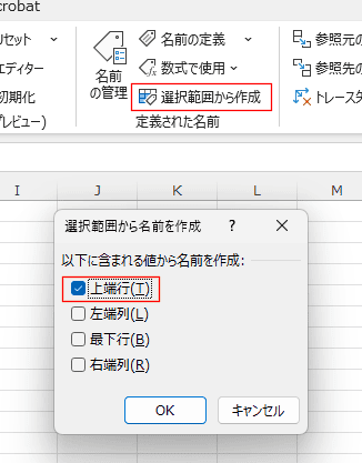 - B2:H10を選択して、[数式]タブの定義された名前グループの[選択範囲から作成]を実行します。