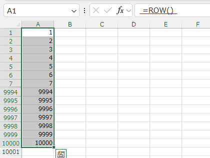 A1:A10000が選択できますので、数式バーに =row() と入力して、[Ctrl]+[Enter]で確定します。