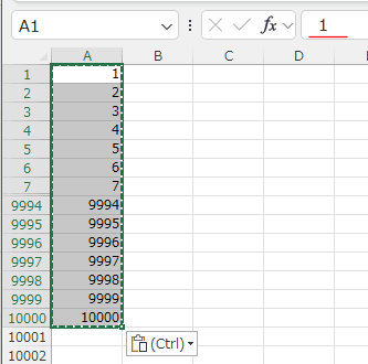 - 関数を数値に変換するのは、A1を選択して、[Ctrl]+[↓]でA1:A10000が選択できます。