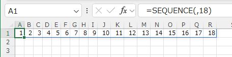 A1セルに =SEQUENCE(,18) と2つ目の引数の列に18と入力するだけで、列方向へ 1〜18の連番を作成できます。
