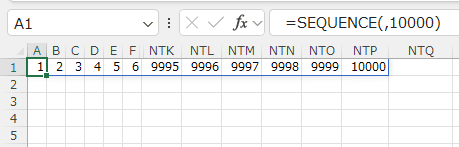 A1セルに =SEQUENCE(10000) と入力するだけで、1〜10000の連番を作成できます。