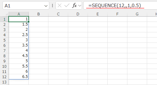 - A1セルに =SEQUENCE(12,,1,0.5) と入力するだけで、1から0.5刻みの連番を12個作成できます。