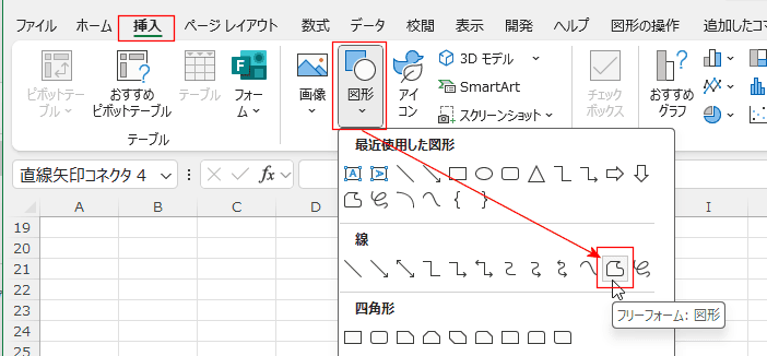 - [挿入]タブの[図形]をクリックし、「線」にある「フリーフォーム」を選択します。