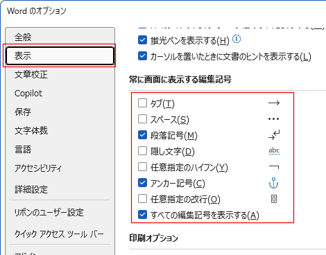 - Wordのオプションを表示します。[表示]タブを選択します。