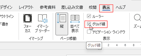 - [表示]タブの表示グループにある[グリッド線]にチェックのON/OFFで表示/非表示を切り替えます。
