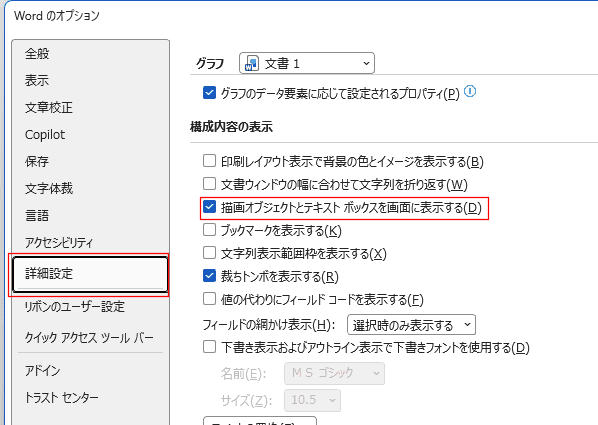 構成内容の表示で「描画オブジェクトとテキストボックスを画面に表示する」にチェックを入れます。