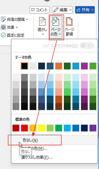 - [デザイン]タブのページの背景グループの[ページの色]→[色なし]を選択します。