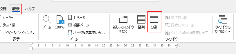 - [表示]タブのウィンドウ グループにある [分割]をクリックします。