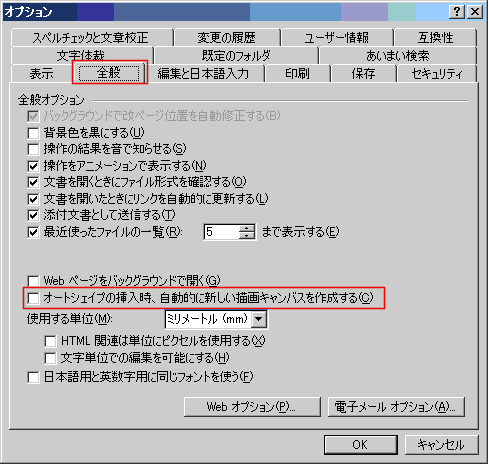 - [全般]タブの[オートシェイプの挿入時、自動的に新しい描画キャンパスを作成する]のチェックをはずします。
