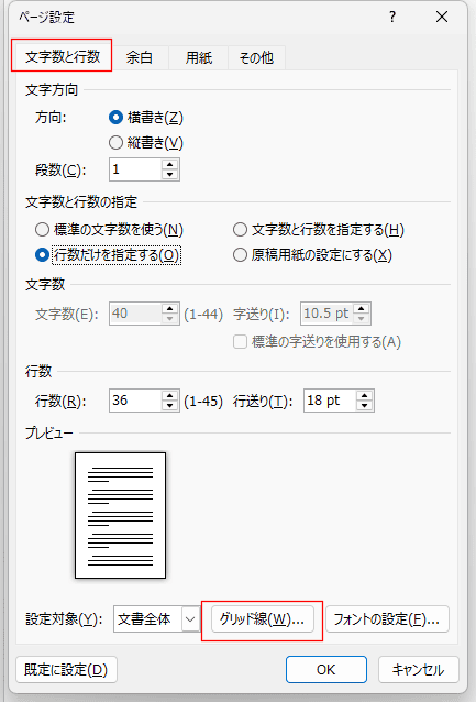 [文字と行数]タブの下部にある[グリッド線]をクリックします。