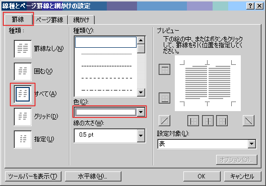 - [罫線]→[線種とページ罫線と網かけの設定]の罫線タブを選択します。