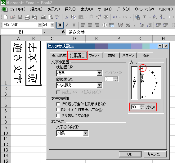 - [書式]→[セル]の配置タブでそれぞれの配置を-90度と90度に設定します。