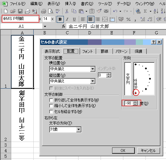- A1:A2セルを選択してフォントボックスで「@MS P明朝」とフォント名の前に「@」を入力します。