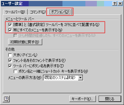- [標準]と[書式設定]ツールバーを2行に並べて配置する