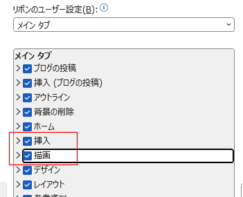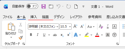 - 下図のように、挿入タブと描画タブが表示されました。