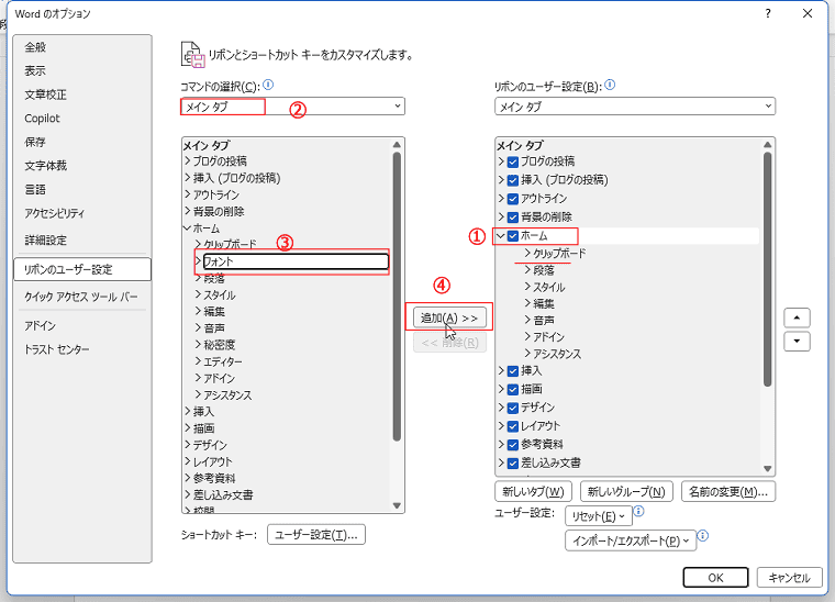 [リボンのユーザー設定]を選択します。
