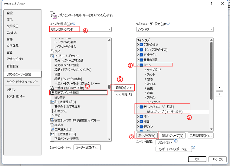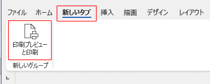 - 新しいタブの新しいグループに「「印刷プレビューと印刷」コマンドボタンが表示されました。